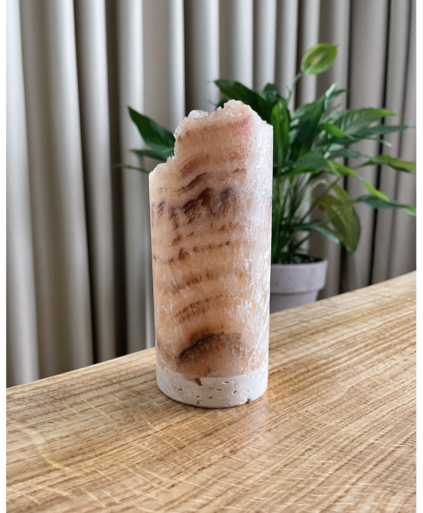• Form: stone cylinder with a wax candle inside (filled with a reusable tealight candle).