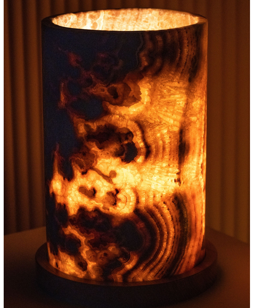 Thanks to its translucency, onyx creates an extremely atmospheric glow that gently penetrates through the natural veins of the stone. When the light is turned on, the lamp comes to life – transforming into a luminous sculpture that gives the room elegance and a unique character.