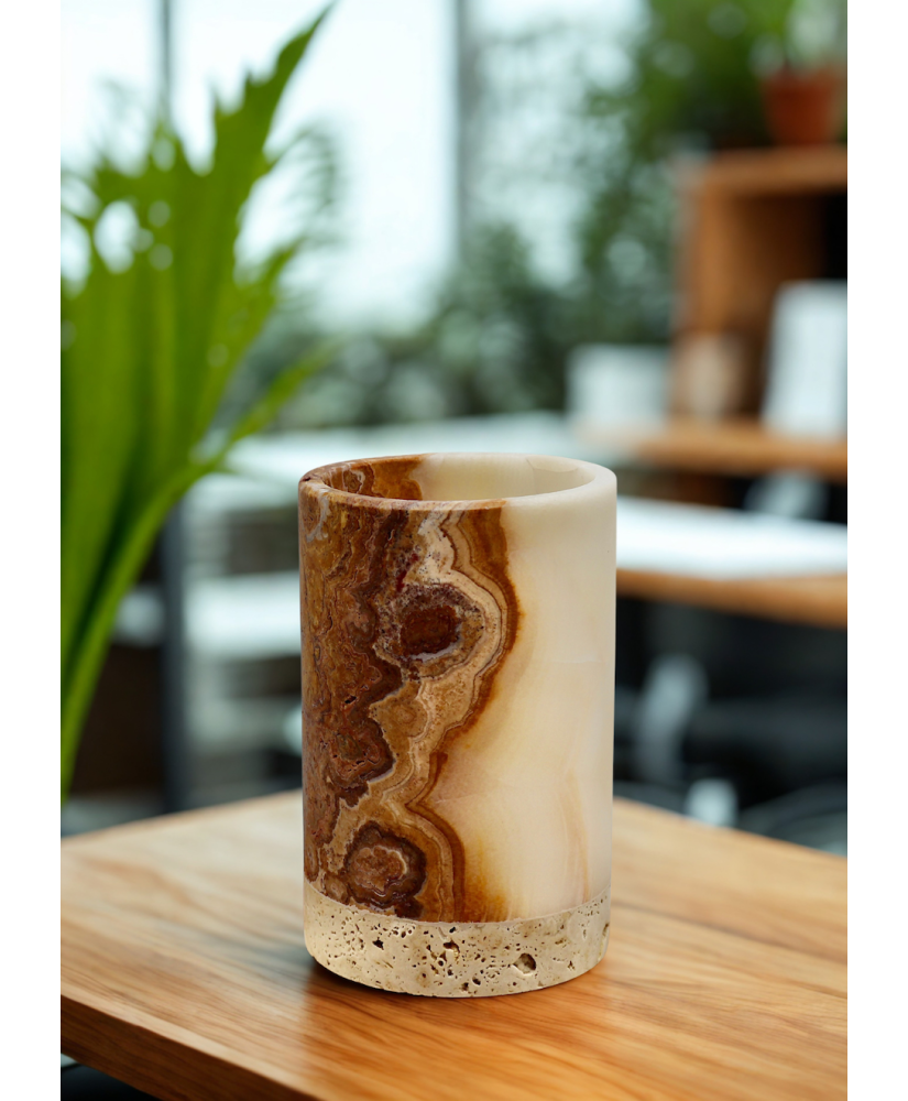 Bring a touch of luxury into your home with our unique natural onyx candle holder. Each piece is one-of-a-kind—handcrafted from genuine stone that captivates with its natural patterns and colors.