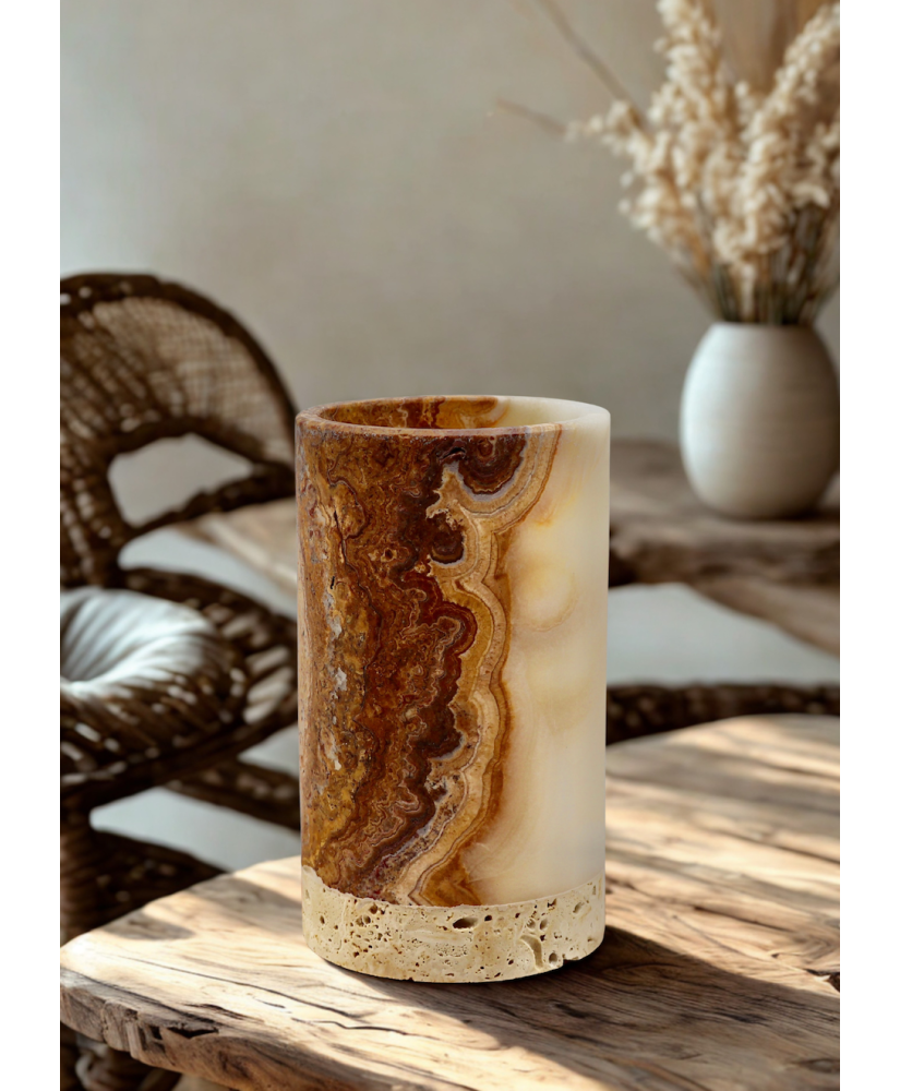 Bring a touch of luxury into your home with our unique natural onyx candle holder. Each piece is one-of-a-kind—handcrafted from genuine stone that captivates with its natural patterns and colors.