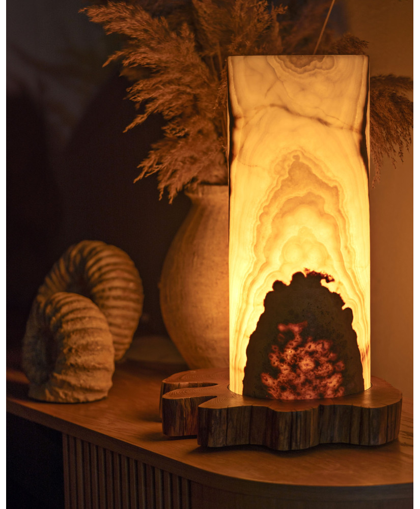 Każdy egzemplarz powstaje z unikatowego fragmentu onyksu, dzięki czemu nie istnieją dwie identyczne lampy. Naturalne żyłkowania i barwy czynią osłonę indywidualnym dziełem natury — stworzonym specjalnie dla jednej przestrzeni i jednego właściciela.
