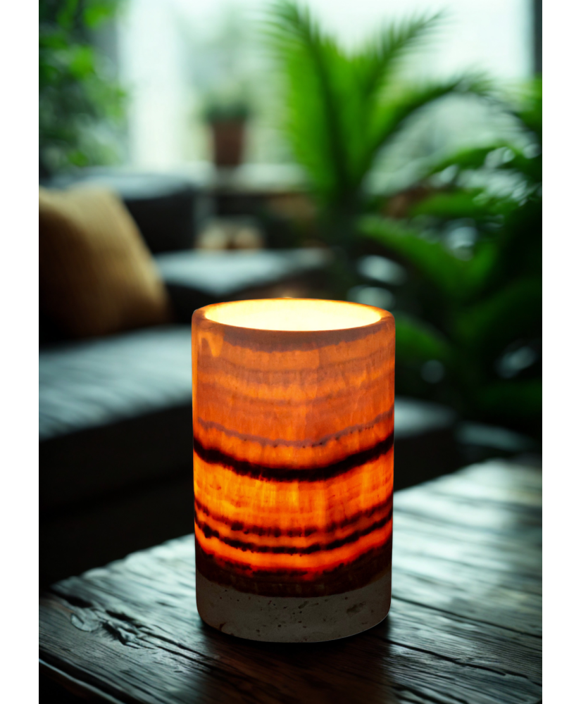 Osłonka na świecę z onyxu to luksusowy i stylowy element dekoracyjny, który przyciąga wzrok naturalnym pięknem i unikatowym wzorem kamienia. Onyx, znany ze swoich charakterystycznych warstw i półprzezroczystości, doskonale rozprasza światło płomienia, tworząc ciepłą, nastrojową aurę.