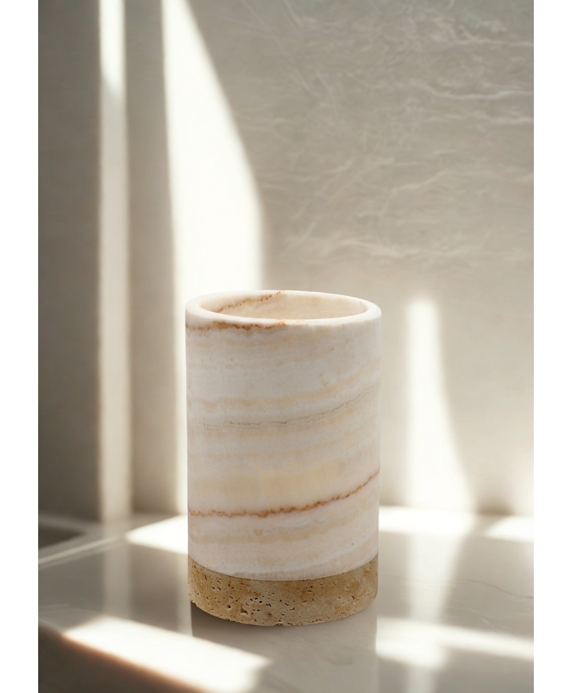 Osłonka na świecę z onyxu to luksusowy i stylowy element dekoracyjny, który przyciąga wzrok naturalnym pięknem i unikatowym wzorem kamienia. Onyx, znany ze swoich charakterystycznych warstw i półprzezroczystości, doskonale rozprasza światło płomienia, tworząc ciepłą, nastrojową aurę.
