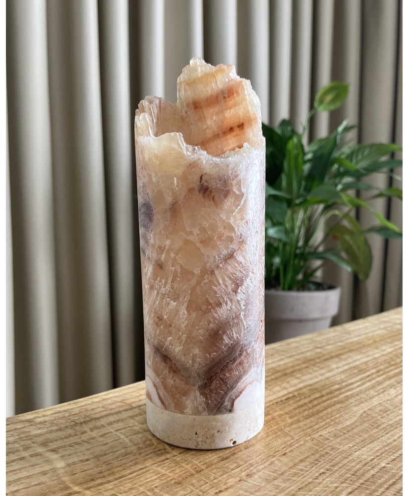 Świeca z onyxu to luksusowy i stylowy element dekoracyjny, który przyciąga wzrok naturalnym pięknem i unikatowym wzorem kamienia. Onyx, znany ze swoich charakterystycznych warstw i półprzezroczystości, doskonale rozprasza światło płomienia, tworząc ciepłą, nastrojową aurę.