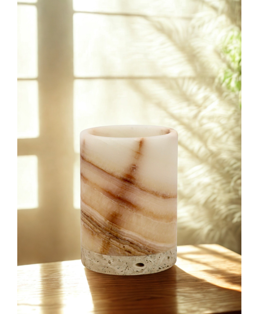 Osłonka na świecę z onyxu to luksusowy i stylowy element dekoracyjny, który przyciąga wzrok naturalnym pięknem i unikatowym wzorem kamienia. Onyx, znany ze swoich charakterystycznych warstw i półprzezroczystości, doskonale rozprasza światło płomienia, tworząc ciepłą, nastrojową aurę.