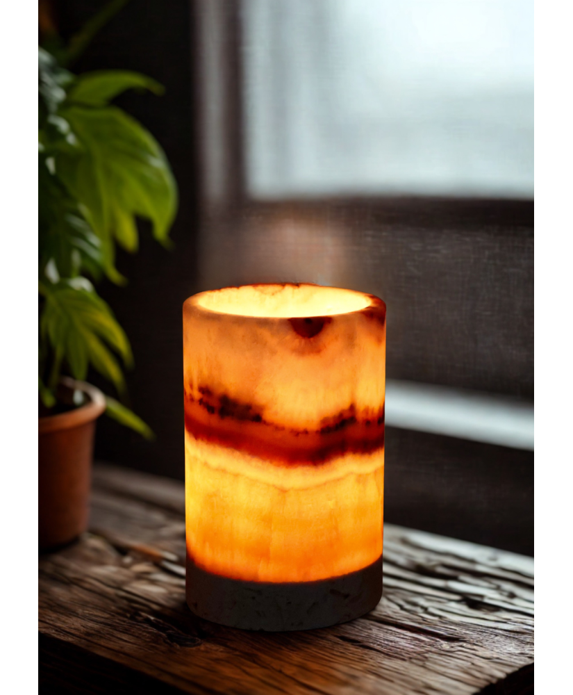 Osłonka na świecę z onyxu to luksusowy i stylowy element dekoracyjny, który przyciąga wzrok naturalnym pięknem i unikatowym wzorem kamienia. Onyx, znany ze swoich charakterystycznych warstw i półprzezroczystości, doskonale rozprasza światło płomienia, tworząc ciepłą, nastrojową aurę.