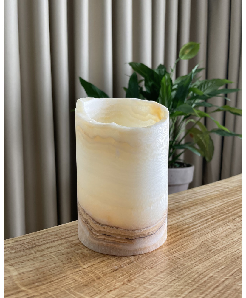 Onyx mum, doğal güzelliği ve taşın benzersiz deseniyle dikkat çeken lüks ve şık bir dekoratif unsurdur. Karakteristik katmanları ve yarı saydamlığıyla bilinen onyx, alevin ışığını mükemmel bir şekilde dağıtır ve sıcak, romantik bir atmosfer yaratır.